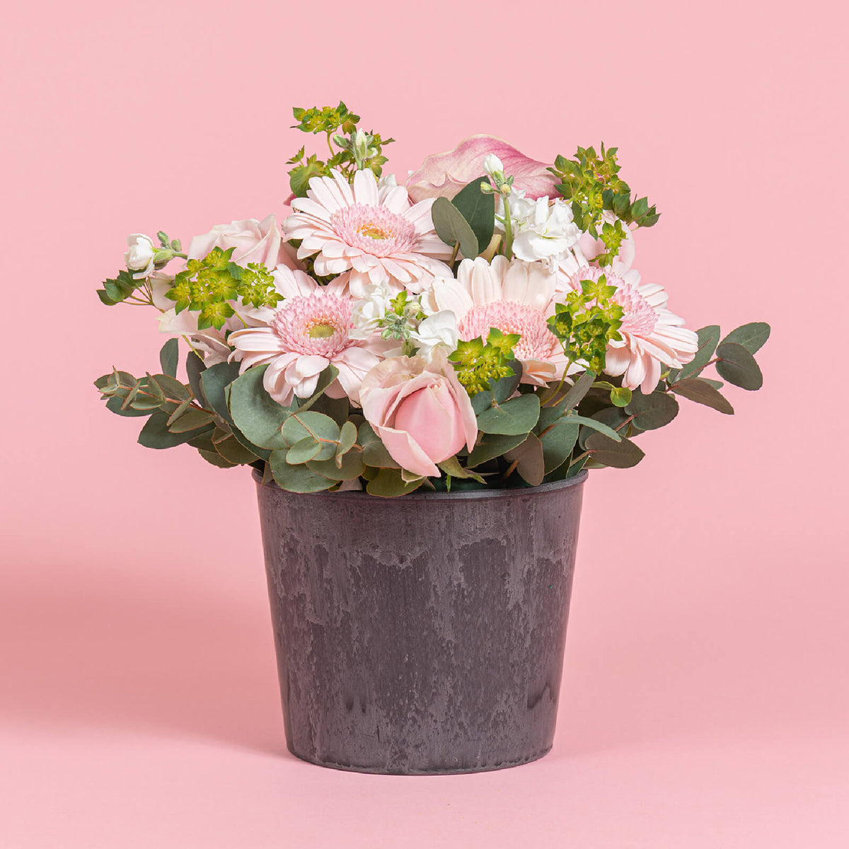 淡いピンクのお花を使用し、グリーンを組み合わせたナチュラルスイートな花束です。可愛らしく持ち運びがしやすいブーケタイプです。